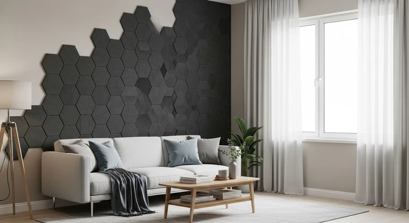 吸音パネル(フェルト系・ウレタン系) 貼って剥がせるタイプを選べば、賃貸でもOK。音の「反響」を抑える効果があり、部屋の中がモワッと響く感じが軽減されます。テレビの後ろ、話し声が気になる方向の壁に貼ると効果的。
