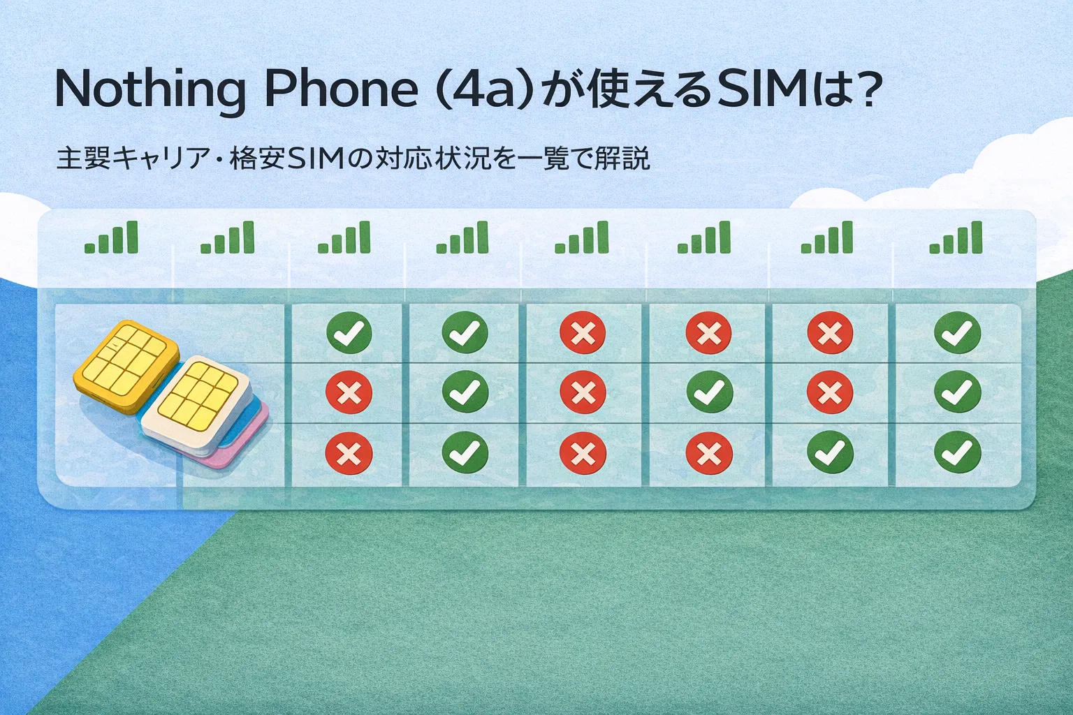 この記事では、Nothing Phone (4a)が使えるSIMを主要キャリア・主要MVNOごとに一覧表で整理し、公式動作確認の有無、eSIM、5Gの状況、そしてどのSIM会社が安心かまでわかりやすく解説しました。